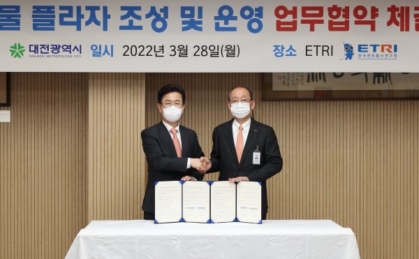 [국회의정저널] 대전시는 28일 한국전자통신연구원 대회의실에서 허태정 대전시장과 한국전자통신연구원 김명준 원장이 참여한 가운데 ‘마중물 플라자 조성 및 운영 업무협약’을 체결했다고 밝혔다.