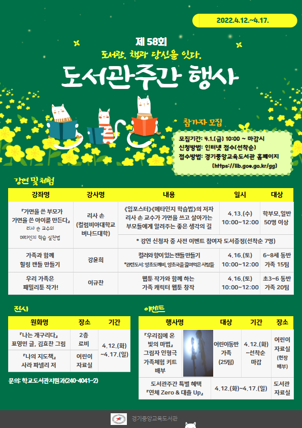 경기중앙교육도서관, 4월 1일부터 도서관 주간 독서문화 프로그램 신청 접수