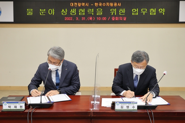 [국회의정저널] 대전시는 31일 대전시청에서 한국수자원공사와 물분야 상생협력을 위한 ‘물분야 상생협력 업무협약’을 체결하고 글로벌 혁신성장 중심지로 도약과 지속 가능한 상호 발전을 위해 긴밀하게 협력하기로 했다고 밝혔다.