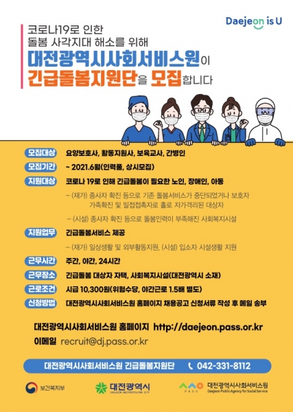 한편 서비스제공 인력은 대전광역시사회서비스원 종합재가센터 기존 돌봄인력을 우선 배치하고 돌봄 수요에 신속히 대응하기 위해 요양보호사, 활동지원사, 보육교사 등 50명을 2월부터 6월까지 인력풀로 상시·공개 모집 중에 있다.