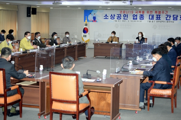 [국회의정저널] 광주광역시는 10일 시청 중회의실에서 지역 소상공인 업종 대표들과 간담회를 갖고 코로나19 장기화로 인해 현장에서 겪고 있는 애로와 건의사항을 가감 없이 듣고 대책을 모색했다.