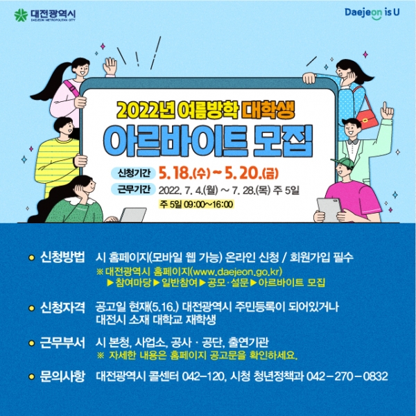 대전시는 16일 여름방학 동안 대전시청과 사업소, 공사·공단 등에서 대전시정과 공직사회 체험을 원하는 대학생 아르바이트를 모집한다고 밝혔다.