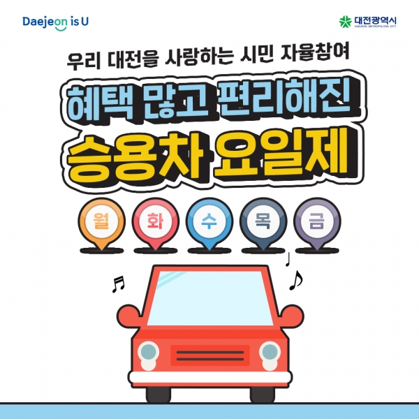 지난해 12월 말 기준으로 대전시에서는 참여대상차량 50만 대의 약 10%에 해당하는 5만 대가 승용차요일제에 참여하고 있다.