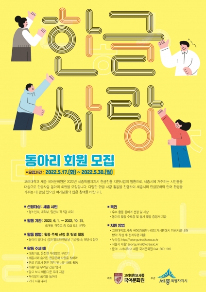 한글사랑동아리, 한글보안관은 2022년 세종특별자치시 한글진흥 지원사업의 일환으로 보조사업자인 고려대학교 세종 국어문화원을 통해 모집이 진행된다.