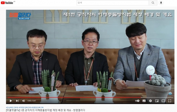 또한 경북교육청 공식 유튜브 채널‘맛쿨멋쿨’을 통해‘공직자의 이해충돌방지법’에 대한 자체 홍보 영상을 제작해 지난 4월부터 배포하고 있으며 소속 공직자들은 어려운 법을 재미있는 영상으로 접하게 되어 한결 이해가 쉬워졌다는 반응을 보였다.