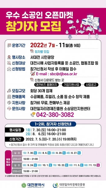 신청대상은 대전시에 사업자등록을 둔 소공인으로서 대전비즈 홈페이지에서 신청서를 다운받아 사업자등록증과 판매물품 목록 등을 이메일로 제출하면 된다.