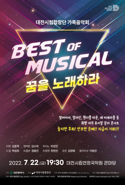[국회의정저널] 대전시립합창단 가족음악회 ‘Best of Musical 꿈을 노래하라’가 오는 22일 금요일 오후 7시 30분 대전시립연정국악원 큰마당 무대에 오른다.