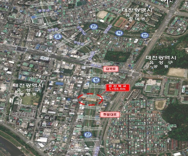 온천북교는 연장 66m, 폭 20m의 왕복 4차로 규모로 유성천으로 단절된 궁동과 봉명동을 연결하기 위해 2019년 공사에 착수했으며 총사업비 54억원이 투입됐다.