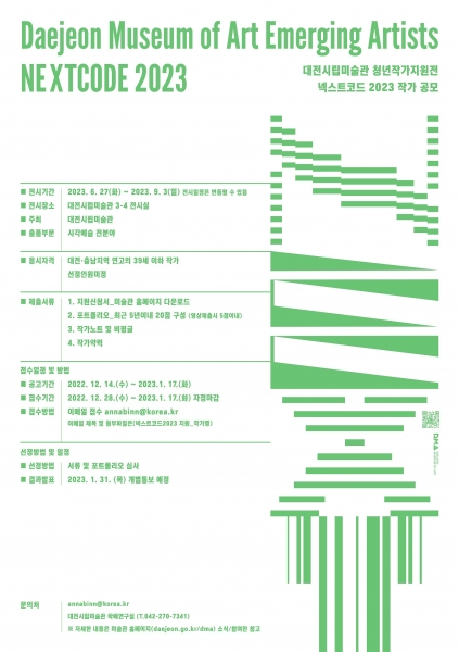 [국회의정저널] 대전시립미술관는 대전·충남 지역의 주목할 만한 청년작가를 발굴해 소개하는‘넥스트코드 2023’의 참여작가를 공모한다고 밝혔다.