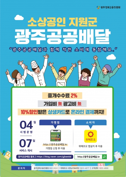 ‘광주공공배달’은 ‘위메프오’ 앱을 사용하고 광주경제고용진흥원이 주관하며 외식업중앙회, 프랜차이즈협회, 소상공인연합회, 시장상인회 등 소상공인 단체가 협력하고 광주광역시가 행·재정적인 지원을 한다.