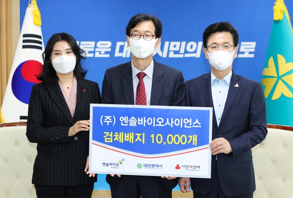㈜엔솔바이오사이언스는 글로벌 혁신 신약 개발에 앞장서고 있는 대전 탑립동 소재 바이오기업으로서 이날 기탁식에는 허태정 대전시장과 김해진 ㈜엔솔바이오사이언스 대표 등 관계자들이 참석했다.