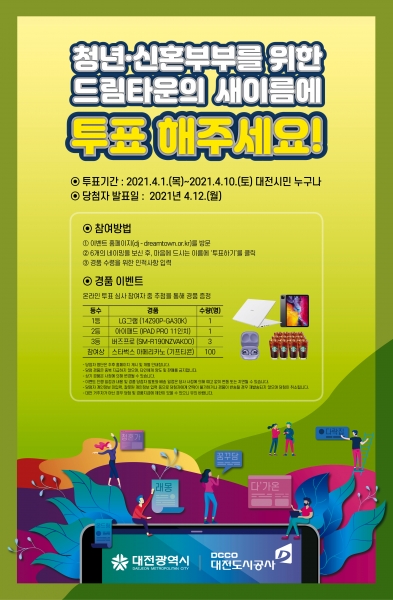 [국회의정저널] 대전시는 청년·신혼부부를 위한 드림타운의 브랜드 네이밍을 선정하기 위해 4월 1일부터 10일까지 온라인을 통해 시민 선호도 조사를 실시한다.