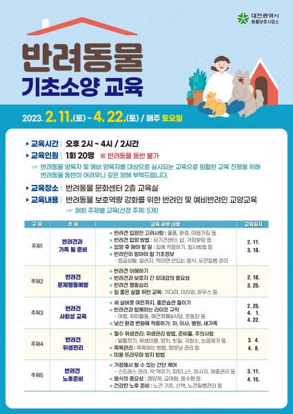 반려동물 기초소양 교육은 대전반려동물공원 문화센터 2층 교육실에서 2월 11일부터 4월 22일까지 매주 토요일 오후 총 11회에 걸쳐 진행되며 1회 교육 인원은 20명이다.