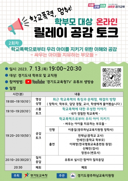 [국회의정저널] ‘내 아이가 아닌 우리들의 아이’로 바라보기.경기도교육청이 공동체적 시선을 통해 학교폭력으로부터 아이들을 지키기 위한 2회차 ‘온라인 릴레이 공감 토크’를 13일 개최한다.
