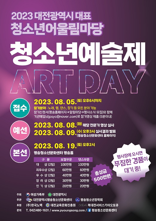 [국회의정저널] 대전시는 제4차 청소년어울림마당인 ‘청소년 예술제 ART DAY’를 오는 8월 19일 오후 1시에 평송청소년문화센터에서 개최한다고 밝혔다.