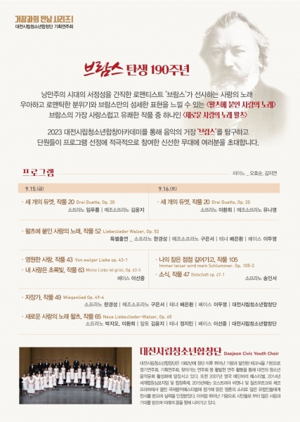 [국회의정저널] 대전시립청소년합창단은 9월 15일 16일 이틀간 대전예술의전당 앙상블홀에서 기획연주 ‘거장과의 만남 시리즈’의 첫 무대로 올해 탄생 190주년을 맞은 로맨틱 시대의 대표적인 작곡가 브람스를 선보인다.