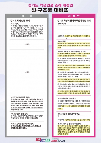 [국회의정저널] 경기도교육청이 경기도 학생인권 조례를 ‘경기도 학생의 권리와 책임에 관한 조례’로 개정안을 확정하고 도의회 제출을 준비 중이다.