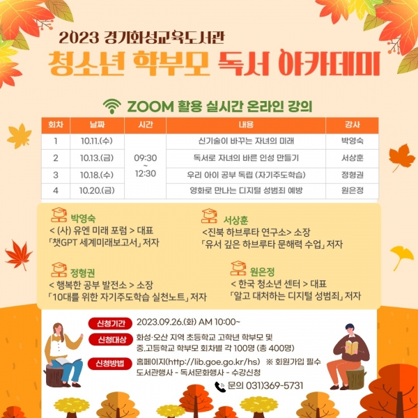 신청은 9월 26일부터 경기화성교육도서관 누리집에서 가능하며 궁금한 사항은 경기화성교육도서관으로 문의하면 된다.