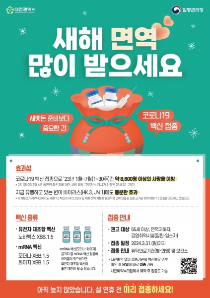 손철웅 대전시 시민체육건강국장은 “이동량이 많고 집단활동이 활발한 설 명절 기간 고위험군의 감염이 증가할 것으로 예상된다”며 “65세 이상 어르신, 면역저하자, 감염취약시설 구성원 등은 설 명절 전에 코로나19 예방접종에 참여해 건강한 설 명절을 보내시기 바란다”고 말했다.