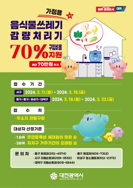 [국회의정저널] 대전시는 가정에서 발생하는 음식물쓰레기를 줄이고 편리하고 위생적인 음식물쓰레기 배출 환경을 조성하기 위해 26일부터 가정용 음식물쓰레기 감량처리기 지원사업을 추진한다.