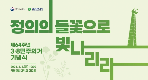 [국회의정저널] 올해로 제64주년을 맞은 3·8대전민주의거 기념식이 8일 오전 10시 국립한밭대학교 아트홀에서 개최된다.