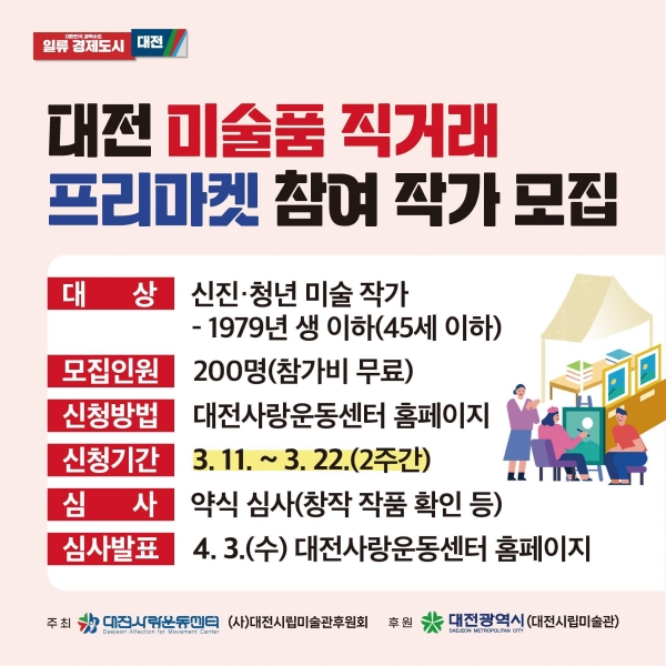 [국회의정저널] 대전사랑운동센터와 대전시립미술관후원회는 신진·청년작가들이 잠재된 재능을 발현해 미래의 예술가로 성장할 수 있도록 작품판로를 지원하고 시민들의 미술품 생애 첫 구입을 지원하기 위해 ‘대전미술품 직거래 프리마켓 참여작가’를 모집한다.
