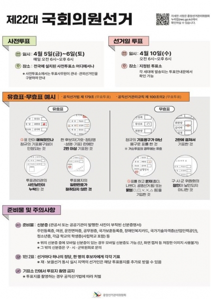 사전투표와 본 투표가 이루어지는 투표소의 명칭과 소재지는 이달 31일까지 관할선관위에서 공고하며 사전투표소는 자운대 내 1개소와 82개 동에 각 1개씩 설치되며 4월 10일 본투표가 실시되는 투표소는 362개소이다.