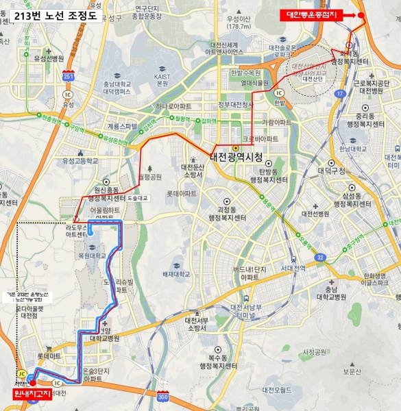 213번은 기존 목원대 기점지를 출발해 원내동 종점으로 운행됐으나, 26일부터는 원내동 기점지를 출발해 목원대학교~대전시청~대전산업단지~대한통운 종점까지 운행되는 노선으로 조정했다.
