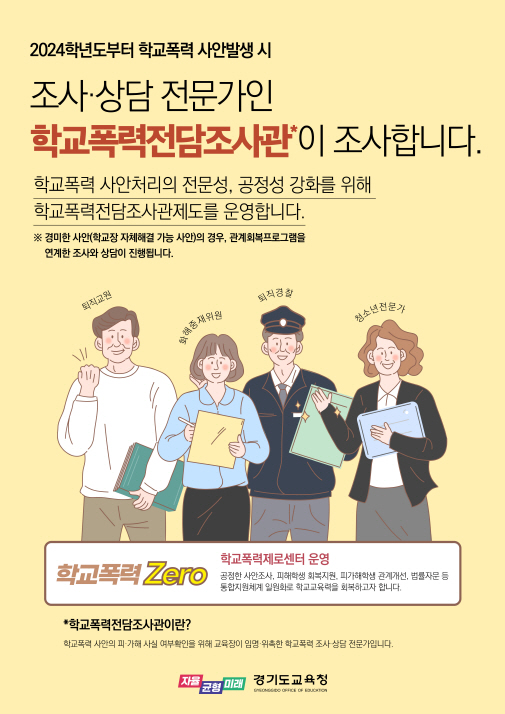 도교육청 이지명 생활인성교육과장은 “경기형 학교폭력전담조사관제가 교육적 순기능을 발휘해 현장에 안착되도록 모니터링과 조사관 역량 강화에 힘쓰겠다”며 “조사관 운영에 대한 현장의 요구와 목소리에 귀 기울여 촘촘히 지원해 나가겠다”고 말했다.
