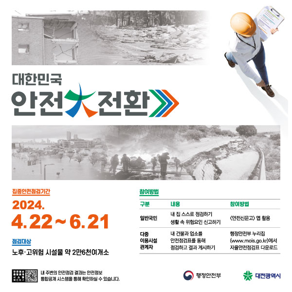 [국회의정저널] 대전시는 4월 22일부터 6월 21일까지 재난·사고 발생 위험을 해소하기 위해 대한민국 안전大전환 집중안전점검을 실시한다.