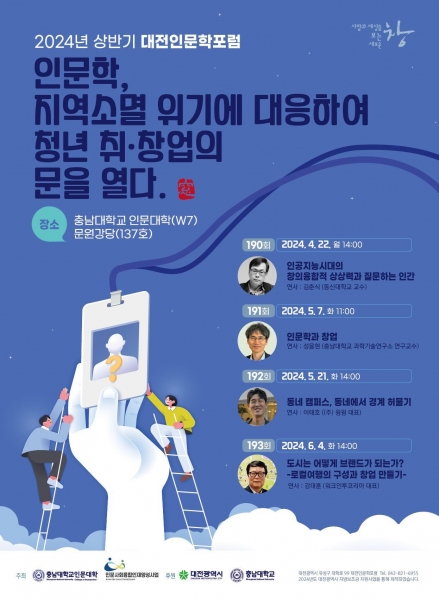 2005년부터 충남대학교와 대전시민들의 인문학적 가치를 공유하기 위해 진행하고 있는 수준 높은 인문학 강연인‘대전인문학포럼’은 올해 스무 해를 맞아 지역소멸 위기와 청년 취·창업에 대한 해결책을 인문학에서 찾아보는 프로그램을 기획했다.