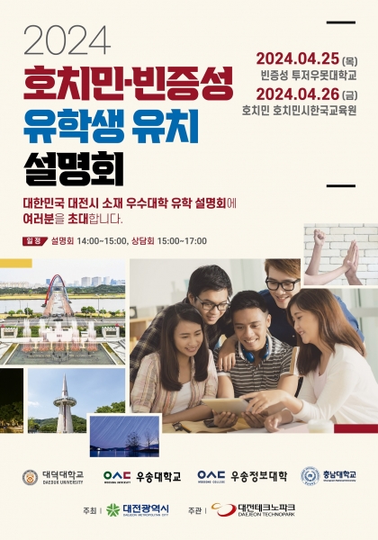 올해는 대덕대, 우송대, 우송정보대, 충남대가 참가해 한국 유학을 희망하는 현지 유학원·어학원생 및 대학생을 대상으로 25일 빈증성 투저우못 대학교, 26일 교육부 부설 호치민 한국교육원에서 합동 설명회를 개최하고 대학별 상담 부스를 운영해 1대1 유학 상담을 진행할 예정이다.