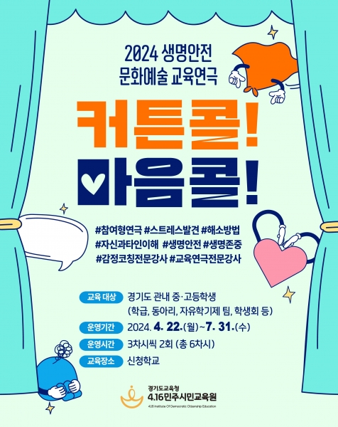 [국회의정저널] 4.16민주시민교육원이 오는 7월 31일까지 경기도 관내 중·고등학생을 대상으로 생명 안전 교육연극 ‘커튼콜, 마음콜’ 프로그램을 운영한다.