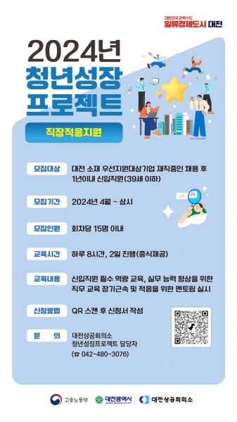 [국회의정저널] 대전시는 고용노동부 신규 공모사업인 ‘청년성장프로젝트’에 최종 선정되어 국비 14억 5,075만원을 확보하고 ‘2024년 청년성장프로젝트’ 참여자를 모집한다.