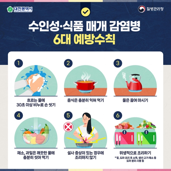 손철웅 대전시 시민체육건강국장은“수인성·식품매개감염병을 예방하기 위해서 손 씻기 등 개인위생수칙을 준수해야 한다”며 “하절기 비상방역 운영체계를 운영해 감염병 예방과 감염병 발생초기 선제적으로 대응에 최선을 다하겠다”고 말했다.