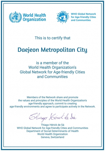 이장우 대전시장은 “고령친화도시 가입은 대전의 65세 이상 인구가 17%를 넘어 초고령 사회 진입을 앞둔 상황에서 매우 의미가 깊다”며 “세계보건기구가 요구하는 기준 이행 및 지역 여건을 반영한 고령친화적 정책을 발굴·추진해 어르신들이 활기찬 노후를 보낼 수 있도록 최선을 다하겠다”고 말했다.