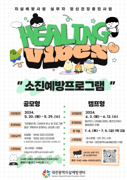 2024년 자살예방 사업 실무자 대상 ‘힐링프로그램’ 과 관련한 자세한 내용은 대전광역정신건강복지센터 홈페이지에서 확인 가능하다.
