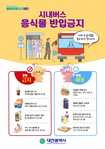 [국회의정저널] 대전시는 시내버스 탑승 시 음식물 반입금지 규정을 담은‘대전시 시내버스 준공영제 운영 조례’가 본격 시행됨에 따라 승차 거부에 대한 구체적 기준을 마련했다.