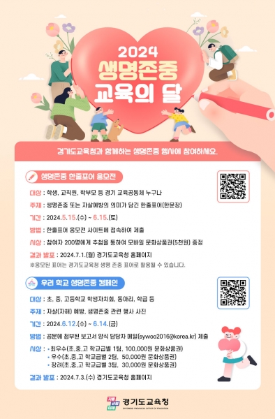 [국회의정저널] 경기도교육청이 생명존중 문화를 확산하기 위해 학생, 학부모, 교직원 모두 참여하는‘생명존중 교육의 달’을 6월 30일까지 운영한다.