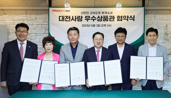 [국회의정저널] 대전시는 3일 신탄진 고속도로 휴게소 내에‘대전사랑 우수 상품관’을 개관하고 한국도로공사 대전충남본부, 재향군인회 휴게소사업본부, 한밭협동조합연합회 동구지회 3개 기관과 업무협약을 체결했다.