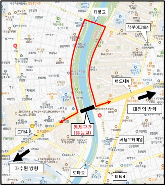 [국회의정저널] 대전시는 지난 10일 새벽 폭우 영향으로 상부 슬래브가 일부 침하된 유등교 전면 통제와 관련해 시민 불편을 최소화하기 위해 25일부터 기존에 유등교를 통과했던 시내버스 20개 노선을 태평교로 우회 운행한다.