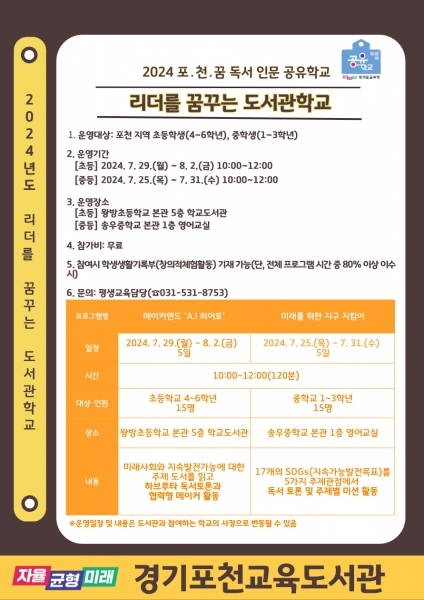 [국회의정저널] 경기포천교육도서관이 오는 25일부터 포천 관내 초·중등 학생 대상으로 공유학교 ‘리더를 꿈꾸는 도서관학교’를 운영한다.