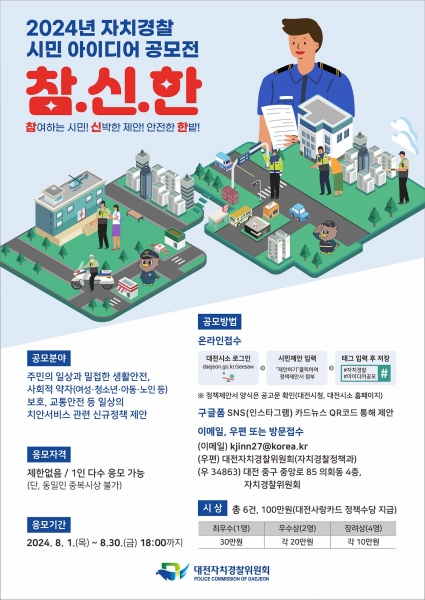 [국회의정저널] 대전자치경찰위원회는 시민의 의견을 반영한 치안정책을 발굴하기 위해 8월 1일부터 8월 30일까지 ‘2024년 대전자치경찰 시민 아이디어 공모’를 추진한다.
