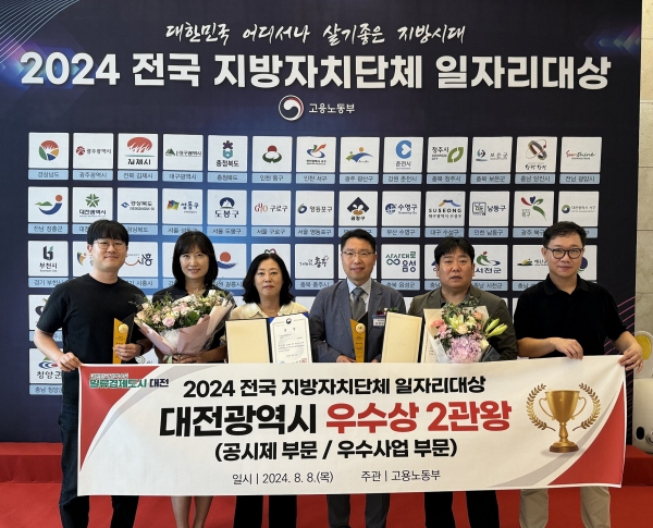 [국회의정저널] 대전시는 8일 서울 서초구 엘타워에서 열린 고용노동부 주관 ‘2024년 전국 지방자치단체 일자리대상’ 시상식에서 일자리 공시제와 우수사업 2개 부문‘우수상’을 수상했다.