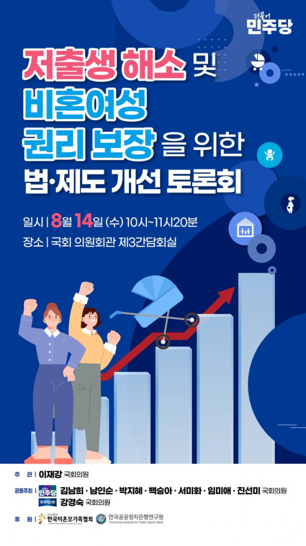 이번 토론회는 이재강 의원의 제안으로 더불어민주당 남인순·진선미·김남희·박지혜·백승아·서미화·임미애 의원, 조국혁신당 강경숙 의원이 공동주최하며 한국미혼모가족협회와 재단법인 한국공공정자은행연구원이 후원한다.