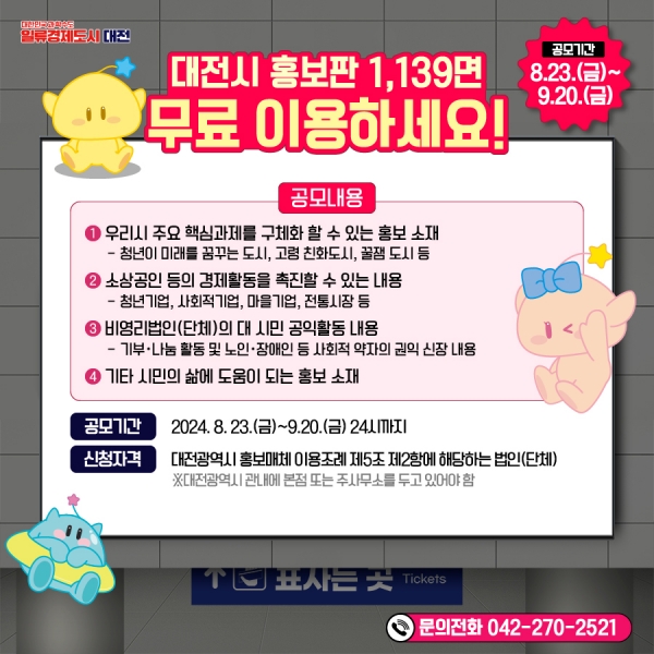 [국회의정저널] 대전시는 8월 23일부터 9월 20일까지 시 보유 홍보 매체를 무료로 이용할 업체를 공개 모집한다.