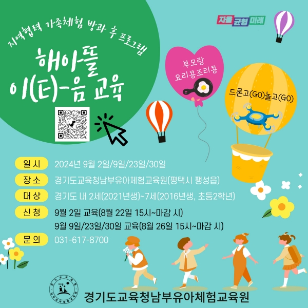 신청은 8월 22일부터 경기도교육청남부유아체험교육원 누리집 안내 홍보 포스터 큐알 코드를 통해 회원가입 후 선착순 접수 가능하다.