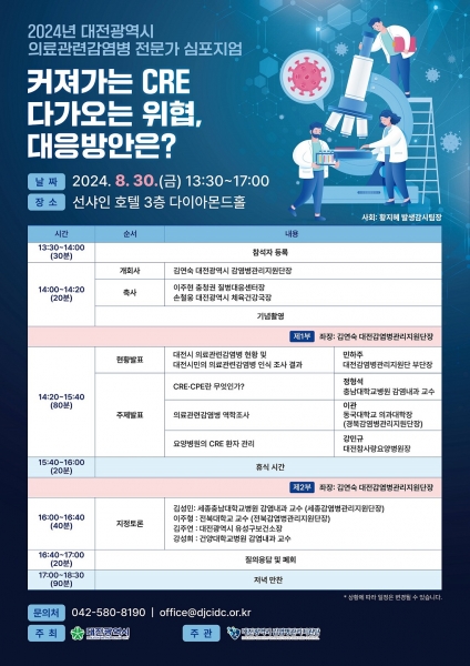 이번 심포지엄에는 대전시를 비롯해 질병관리청, 충청권 질병대응센터, 보건환경연구원, 보건소, 교육청, 의료기관 및 요양병원 관계자 등 80여명이 참석한다.