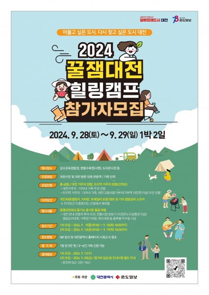 [국회의정저널] 대전시는 관내 주요 캠핑장 및 관광지를 연계한 숙박형 캠핑프로그램‘2024년 꿀잼대전 힐링캠프’ 3회차 참가자를 9월 9일부터 10일까지 2일간 모집한다.