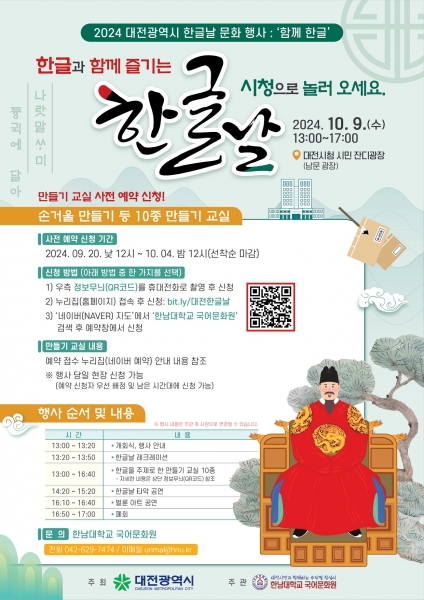 행사는 10월 9일 오후 1시부터 대전시청 시민 잔디광장에서 진행하며 한글과 우리말을 주제로 한 전시와 강연, 문화공연과 한글 만들기 교실을 운영한다.